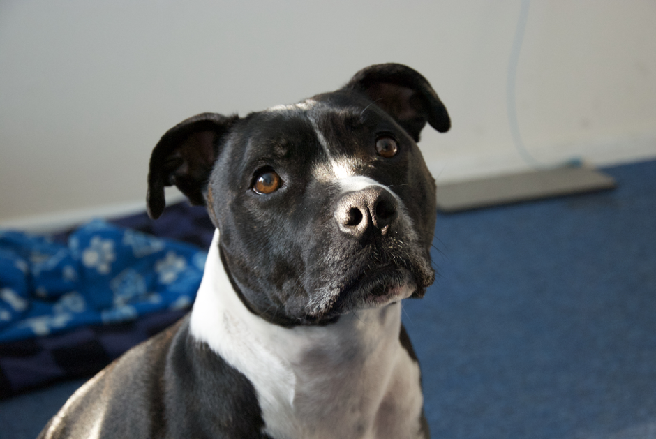 This is Bert the dog at six weeks old. Bert is a Stafford Bull Terrier cross and is a most good natured representative of this much maligned breed. He has a sweet, delightful personality.